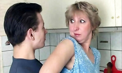 Insatiable, platinum-blonde granny is playing with her tits and her lovers dick, in the kitchen