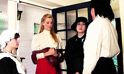 Predominant mistress in corset fucks submissive babe doggy style