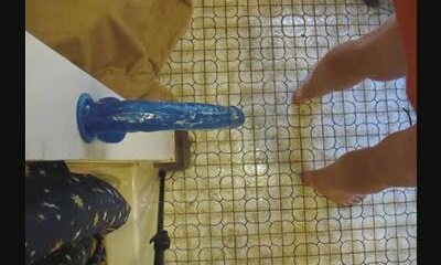 Chastity transgirl fucks 9 inch wall dildo